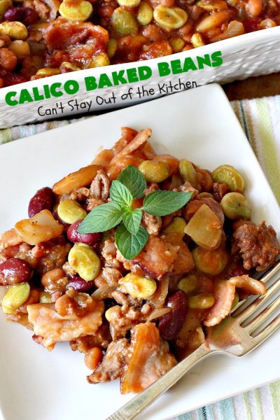 Calico Baked Beans are awesome! Lima Beans, Butter Beans, Kidney Beans and Pork and Beans add zest to this recipe. The beans are mixed with ground beef, bacon and onions in a tasty homemade sauce. The casserole bakes up to absolute perfection.