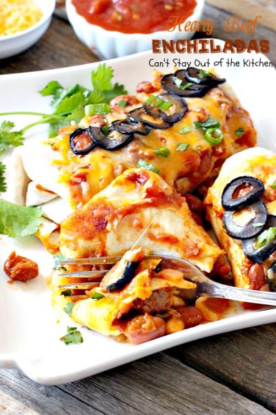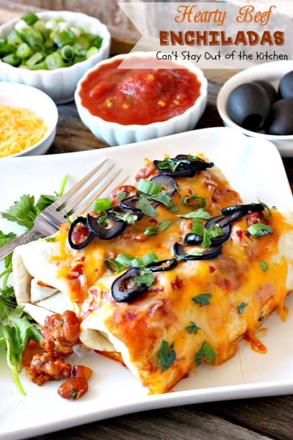Hearty Beef Enchiladas have a wonderful beef and chili bean filling. They are covered with enchilada sauce, cheese, salsa and olives. Garnish with fresh cilantro and green onions and serve with Guacamole and hot sauce.