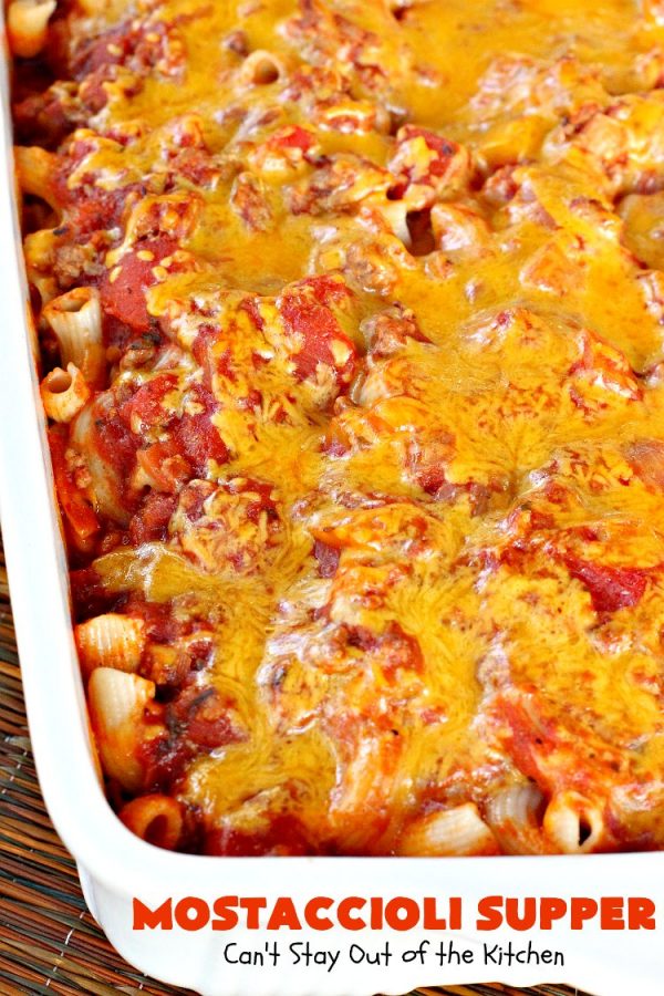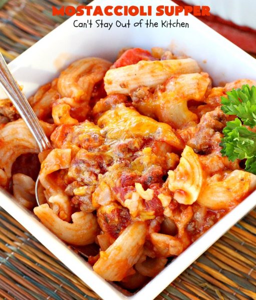 Mostaccioli Supper is a quick and easy casserole that’s kid friendly. It’s terrific for weeknight suppers.