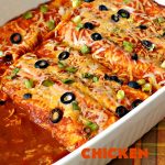 Chicken Enchiladas is a wonderful Tex-Mex recipe. Tortillas are spread with a couple of tablespoonfuls of refried beans. Then you spread a creamy chicken mixture composed of cream of chicken soup, sour cream and shredded chicken over top. This is topped with another spoonful of cheese then rolled up and layered in a pan with enchilada sauce, green onions, sliced ripe olives and more cheese spread over the top. If you enjoy a little southwestern spice, this is comfort food extraordinaire!