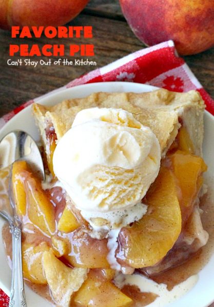 Favorite Peach Pie is a delight. It’s really excellent with vanilla or Snickerdoodle ice cream served on top!