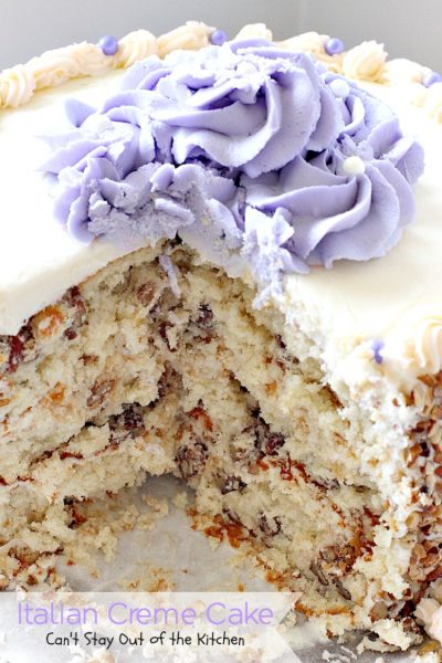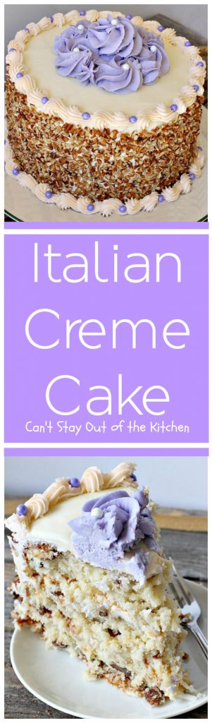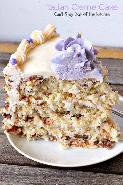 This vintage Italian Creme Cake is awesome. This classic cake recipe is a fantastic. It's filled with pecans and coconut in the batter and has a luscious cream cheese icing. Excellent choice for special occasions and holiday baking, as this elegant and beautiful dessert is sure to rock your world!