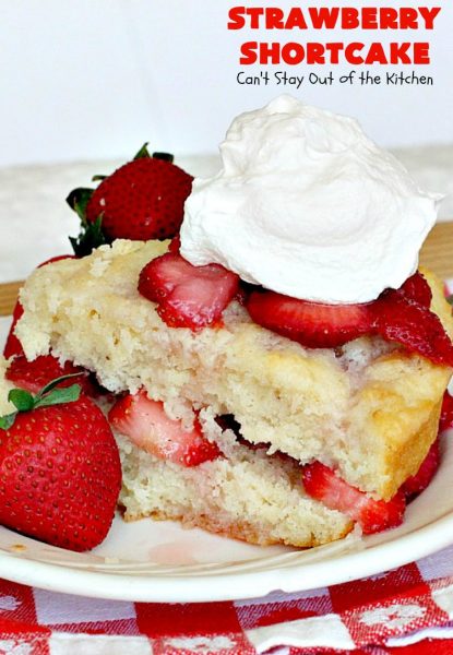 When I initially posted this recipe in July 2012 it was the beginning days of my blog. While my pictures were okay, they were taken with an iPhone camera so they weren’t as clear and sharp as I would have liked. I recently remade this recipe for company (July 2016) and served it for dessert along with a Rosemary Romano Chicken entree, Fresh Summer Veggie Bake and Antipasto Salad. My Strawberry Shortcake was a real hit. I served large portions and they were eaten down to the last drop. 🙂