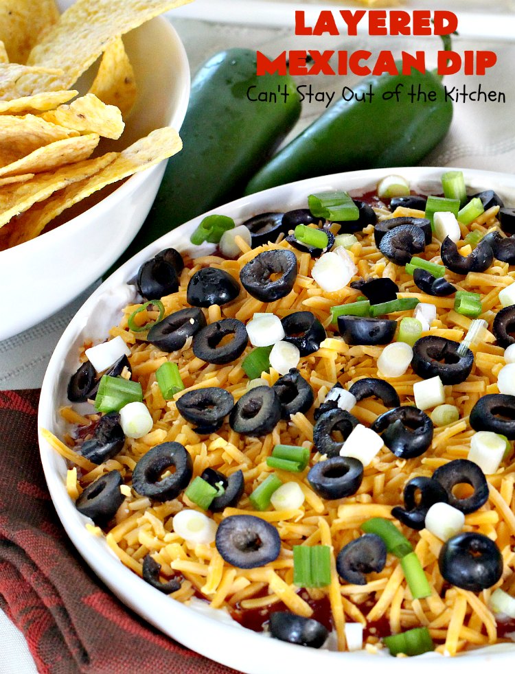 Layered Mexican Dip | Can’t Stay Out of the Kitchen | this super easy 5-ingredient #appetizer can be made in a jiffy! It’s perfect for #tailgating parties, potlucks, grilling out or anytime you’re getting together with company. Everyone always loves it! #salsa #TexMex #cheddarcheese #EasyAppetizer #EasyTexMexAppetizer #LayeredMexicanDip