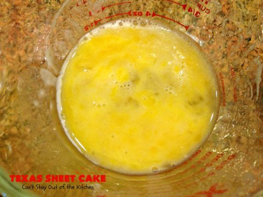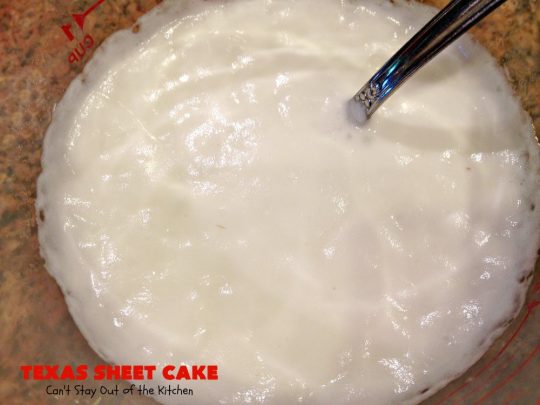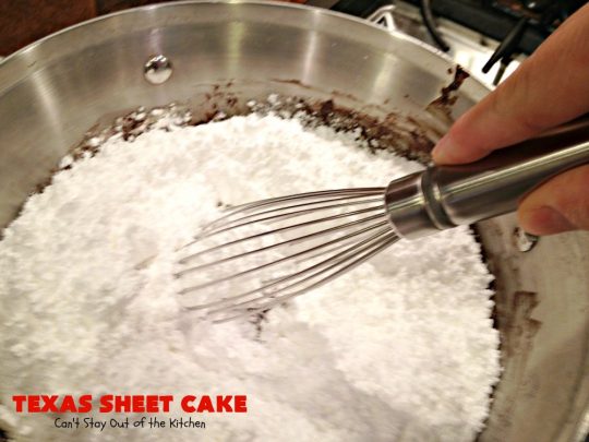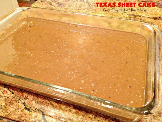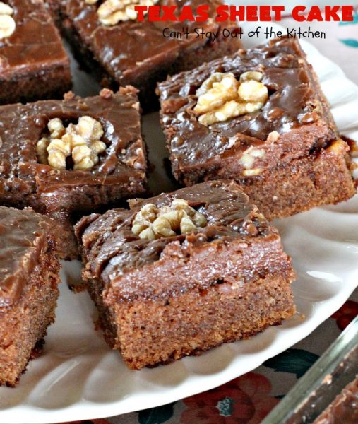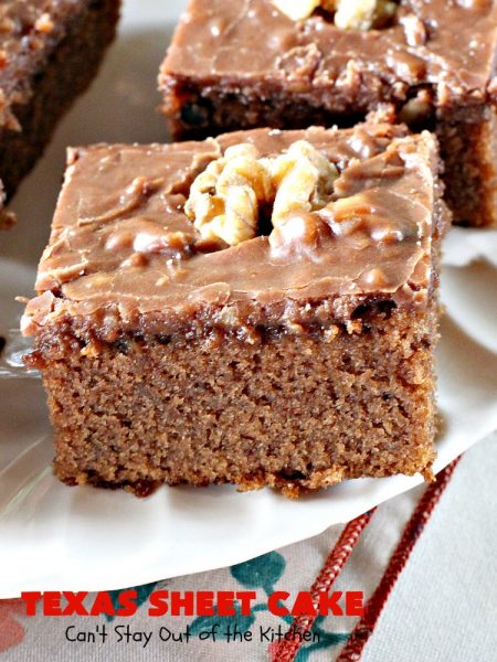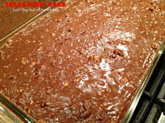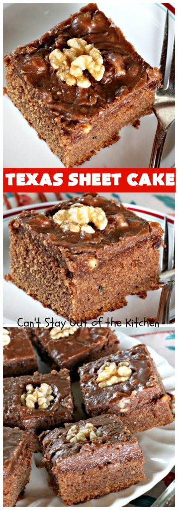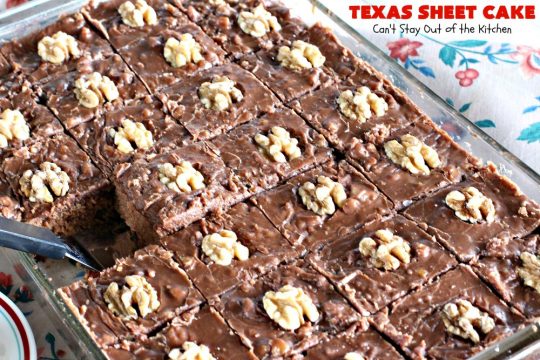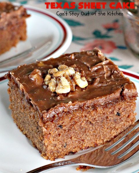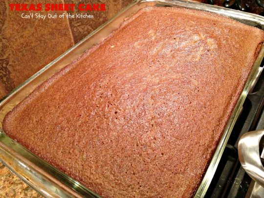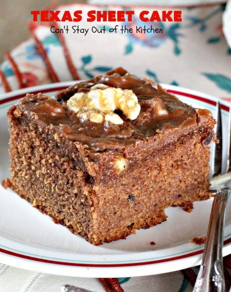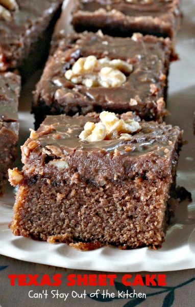 Texas Sheet Cake is a great cake to take to office or tailgating parties, potlucks or holiday gatherings. Everyone loves it and the recipe makes a lot. Are you drooling yet?