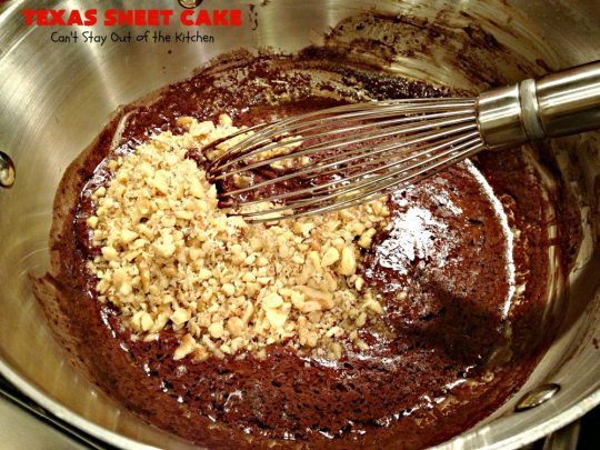The ingredients in this chocolatey, fudgy cake are partially cooked on the stove before baking in the oven. Then the hot cake is topped with a fudge-type icing that includes chopped walnuts. Spectacular is an understatement! It is just incredibly irresistible.