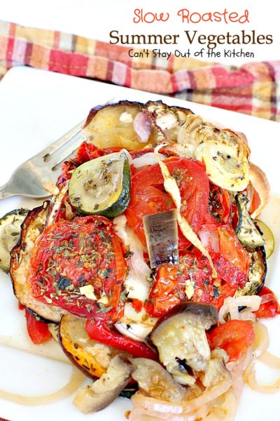 While Slow Roasted Summer Vegetables is great as a side, I highly recommend preparing this dish as a Meatless Monday dish. It’s quite hearty and filling.