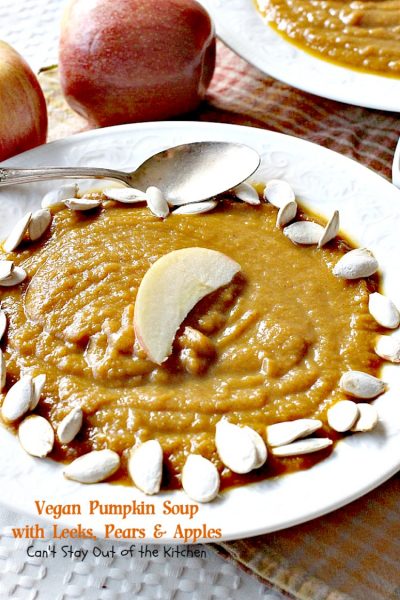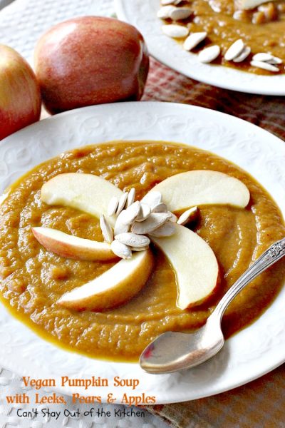 Vegan Pumpkin Soup with Leeks, Pears and Apples has such a wonderful smooth texture and taste. I really love this recipe!