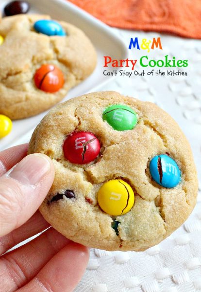 M&M Party Cookies are great for holiday baking when you can find the red and green M&Ms. You can use the pastel colors for Easter, Red for Valentine’s Day, Green for St. Patrick’s Day, orange for Halloween, and Red, White and Blue for July 4th.