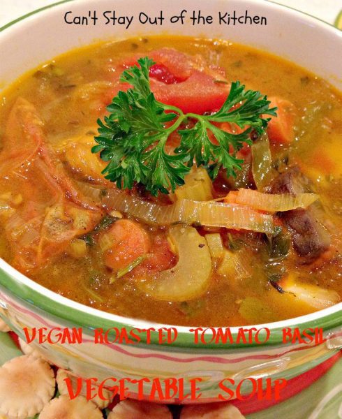 Vegan Roasted Tomato Basil Vegetable Soup | Can’t Stay Out of the Kitchen | Spectacular #soup with #tomatoes, #basil and other #roastedvegetables. #glutenfree #vegan