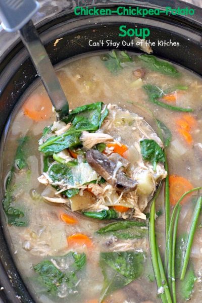 This flavorful Chicken-Chickpea-Potato Soup is chocked full of potatoes, chickpeas, mushrooms, carrots, chicken and other vegetables.