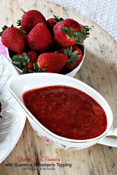 Gluten Free Pancakes with Supreme Strawberry Topping are absolutely awesome. My niece, Heather, sent me a delicious strawberry glaze for pancakes a couple of years ago and I finally got around to trying it. The original recipe is simple–only 3 ingredients and I even substituted honey for the sugar in the recipe and it still turned out wonderfully.