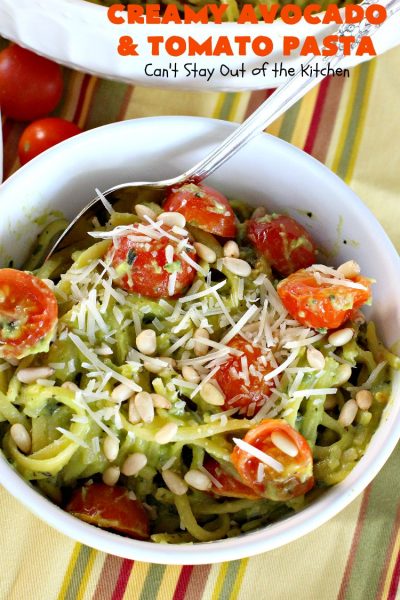 I hope you give Creamy Avocado and Tomato Pasta a try sometime. It’s decidedly different but has quite a gourmet taste. It’s also perfect for Meatless Mondays, Lent, or any other time you want a delicious main dish without meat. If you leave off the parmesan cheese topping, you can easily have a vegan version of this entree as well.