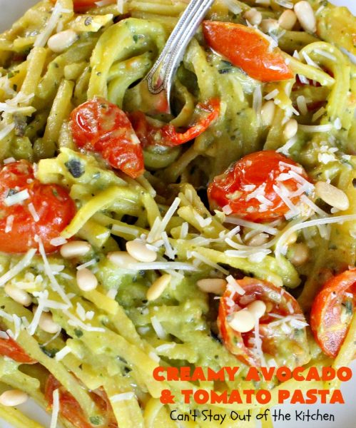 Creamy Avocado and Tomato Pasta has a wonderful avocado taste. The grated parmesan cheese enhances the robust flavor of the pasta and the pine nuts add a nice crunch.