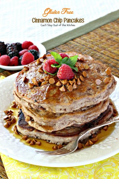Gluten Free Cinnamon Chip Pancakes are a great family treat for Saturday or Sunday breakfasts or if you decide to have breakfast for dinner. But I would recommend you add something salty to the menu like bacon, ham or sausage, some fried potatoes, or sausage gravy and biscuits to counteract the extraordinary sweetness in this recipe!