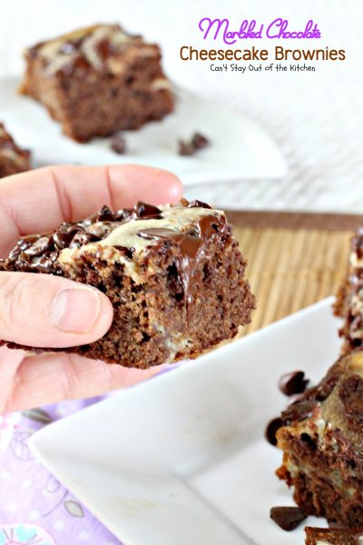 Marbled Chocolate Cheesecake Brownies are terrific. Chocolate, cheesecake, chocolate chips–what’s not to love with this great combination??? The rich chocolatey flavor permeates this delicious dessert and it is incredibly tasty.