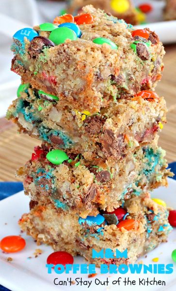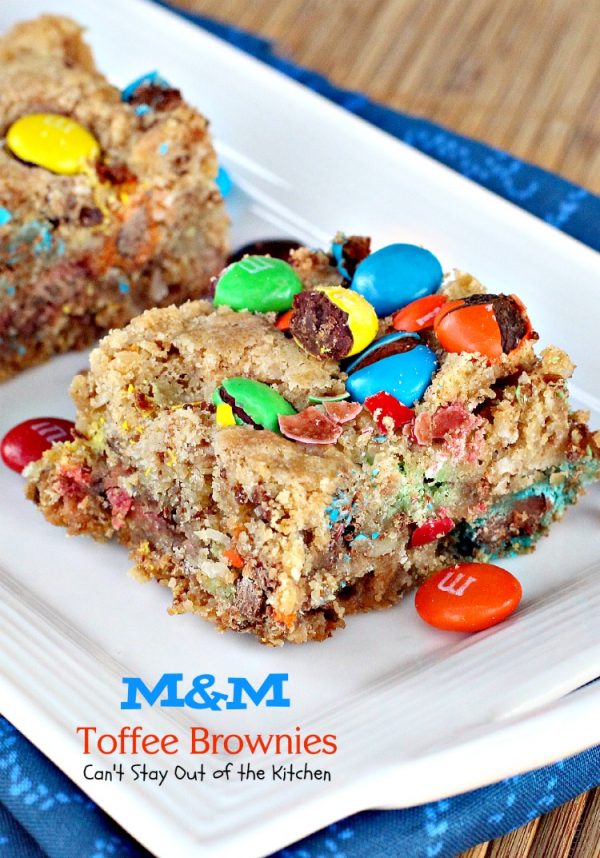 M&M Toffee Brownies are nothing short of sensational! These delectable brownies have M&Ms, coconut, pecans, AND Heath Toffee Bits! Wow! Talk about to die for! These are truly drool-worthy! All that chocolate. All that toffee. All that coconut. All that sugar! Oh, yeah.