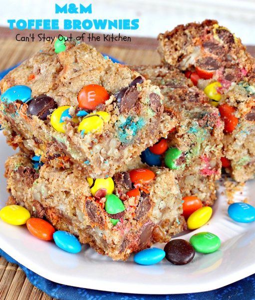I recently remade these luscious brownies (February 2015) for our Super Bowl Party 2015. They were a tremendous hit. Who doesn’t enjoy M&M’s in brownie form? All our party-goers did. I also took some new pictures to update this post. I hope you’ll give M&M Toffee Brownies a try sometime soon.