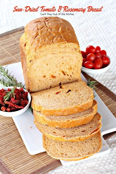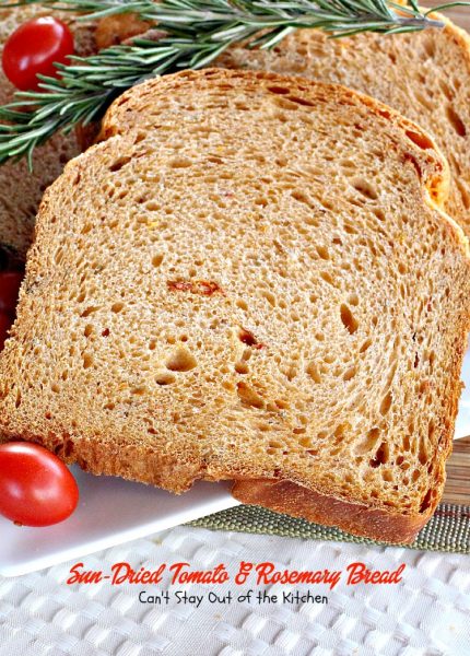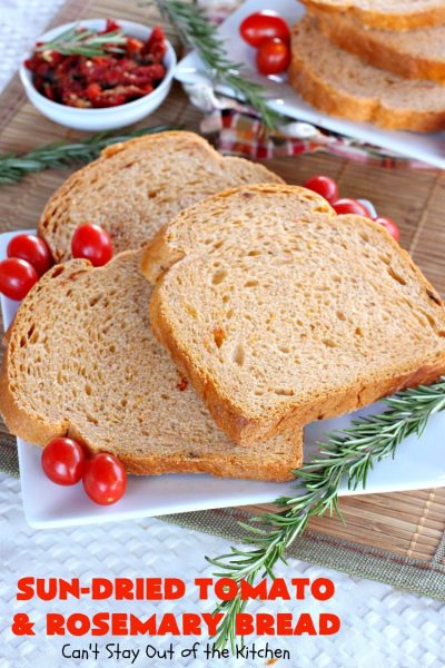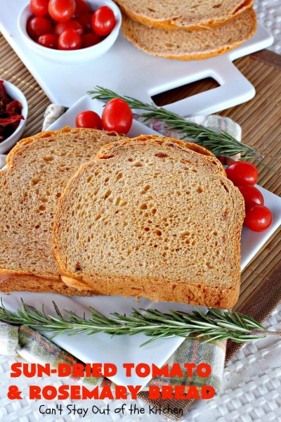 Sun-Dried Tomato and Rosemary Bread is one of my favorite breadmaker breads. It uses lovely sun-dried tomatoes with basil and it’s spiced with rosemary and paprika. While the original recipe calls for Crisco shortening, I usually make this with olive oil instead. This tasty bread is fabulous as a dinner bread, but I eat it anytime including for breakfast! It’s great with a few fried eggs served over top of some of the toasted bread.