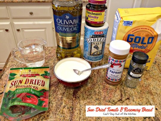 This is a great recipe if you’re making homemade bread for company or just for family dinners. It’s really a nice accompaniment to soups and chowders, although we served it with Apricot Glazed Ham, Loaded Bacon Ranch Potato Bake, Healthy Broccoli Salad, and Savory Butternut Squash Bake. This bread has great flavor not just because it has sun-dried tomatoes but the rosemary and paprika in the recipe provide pizazz and boldness!