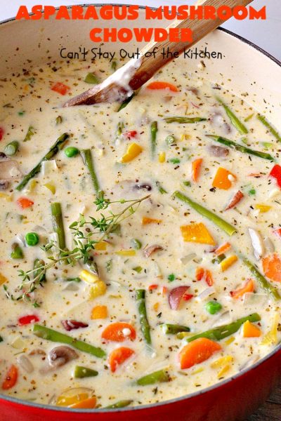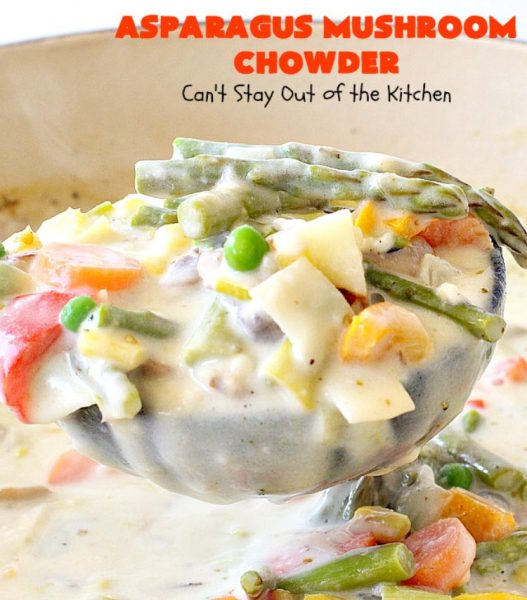 Asparagus Mushroom Chowder is heavenly. This lovely soup is filled with fresh asparagus, mushrooms, carrots, red potatoes, leeks, corn, peas and colorful bell peppers. It’s made creamy with half-and-half and seasoned to perfection with thyme, marjoram and rosemary. It’s one of those spectacular stick-to-the-rib meals that’s completely filling and satisfying.