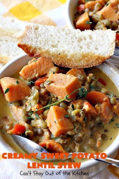 Creamy Sweet Potato Lentil Stew is terrific on cold winter nights with a slab of bread.