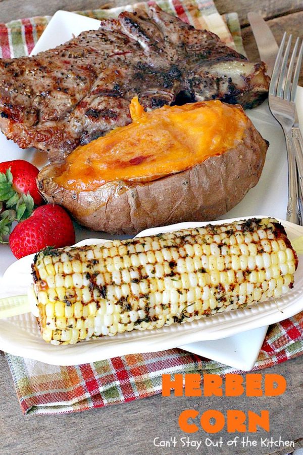 I recently remade this recipe again (August 2018) and took a few new pictures since the pictures posted looked a little dried out! 🙁 I served it with Montreal Seasoned Steak and Baked Sweet Potatoes. Herbed Corn is still as delicious as ever!