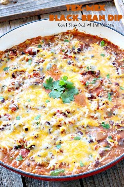 This marvelous Tex-Mex Black Bean Dip is the BEST you will ever taste! It’s filled with the Tex-Mex ingredients and spices popular in most Tex-Mex recipes: black beans, diced chilies, diced tomatoes, salsa, cumin, chili powder, cilantro and a Mexican cheese blend.