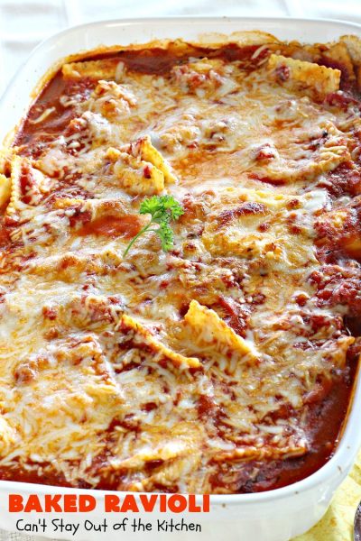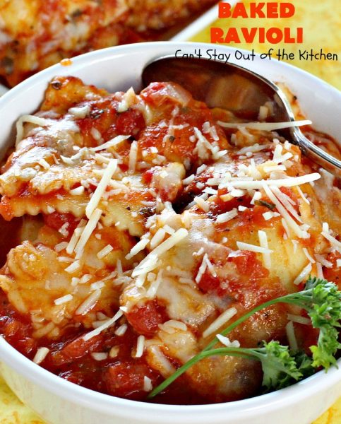 Baked Ravioli is kid friendly, too. This dish is quite easy to double in case you want to make another pan for a freezer meal or take a pan to new mothers or sick friends. This casserole also sets up really well along with being an economical main dish entree.