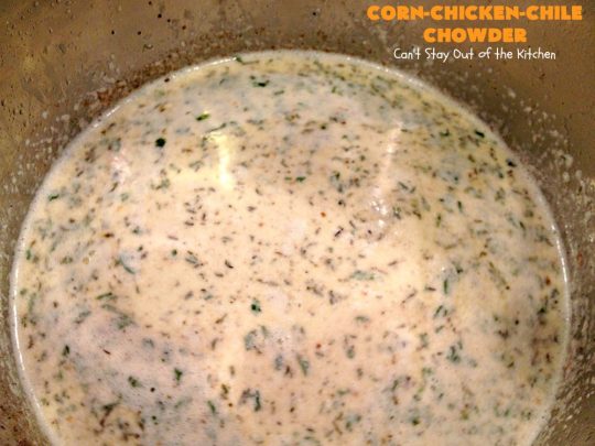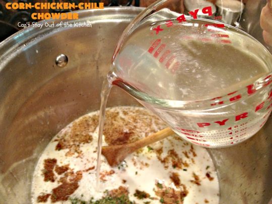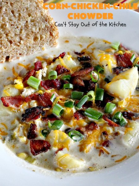 Corn Chicken Chile Chowder | Can't Stay Out of the Kitchen | this fantastic #TexMex #soup is hearty, satisfying & so filling. It's filled with Southwestern flavors that give it zest, but it's not overpowering. #corn #chicken #chowder #GreenChilies #CornChowder #GlutenFree #CornChickenChileChowder