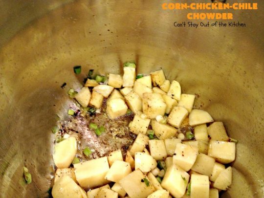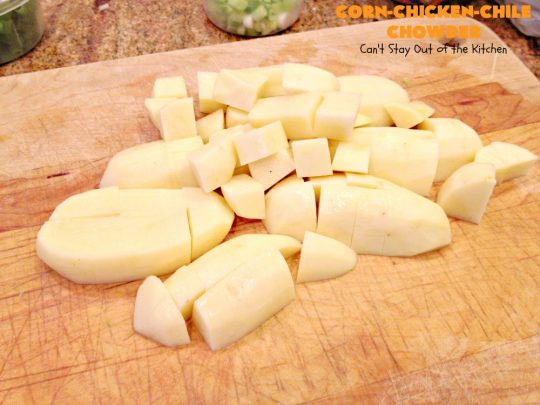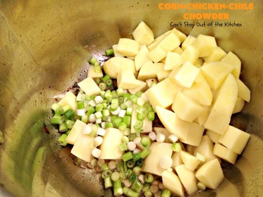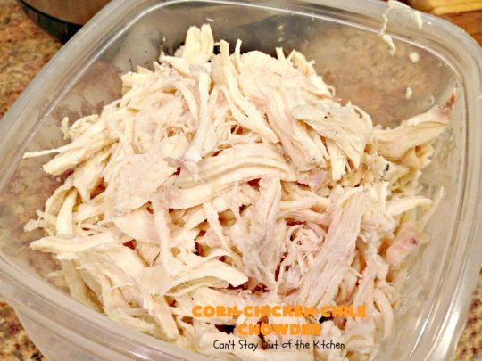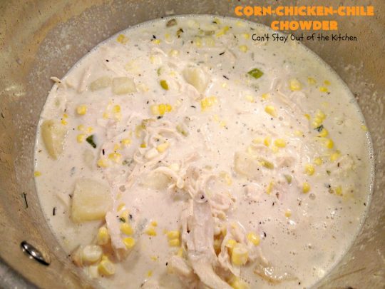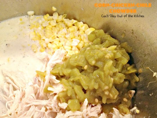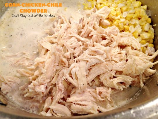 Once potatoes have cooked, add corn, chopped or shredded chicken and green chilies.