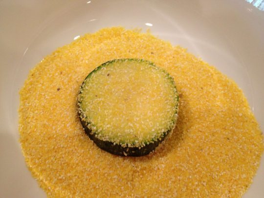 - Dredge zucchini slices into cornmeal to cover completely on one side.