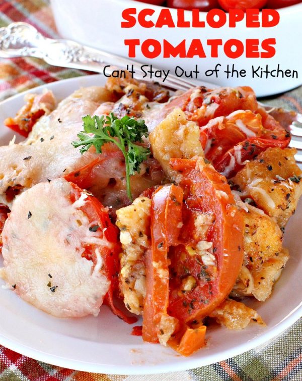 Escalloped Tomatoes | Can't Stay Out of the Kitchen | This is one of my favorite side dishes. It's a great #casserole for chicken or pork. It's also an easy #veggie to make for #Thanksgiving or #Christmas. #tomatoes #cheese
