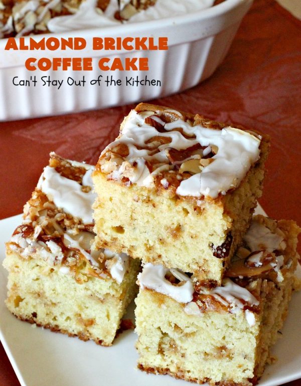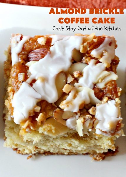 Almond Brickle Coffee Cake | Can't Stay Out of the Kitchen | this spectacular #CoffeeCake absolutely rocks! It's made with #almonds & #HeathEnglishToffeeBits. Every bite will have you drooling. Terrific for a #Holiday or company #Breakfast or for #Dessert. #Easter #cake #HolidayDessert #EasterDessert #MothersDayDessert #AlmondDessert #ToffeeDessert #AlmondBrickleCoffeeCake #LandOLakes