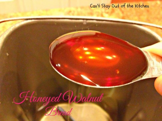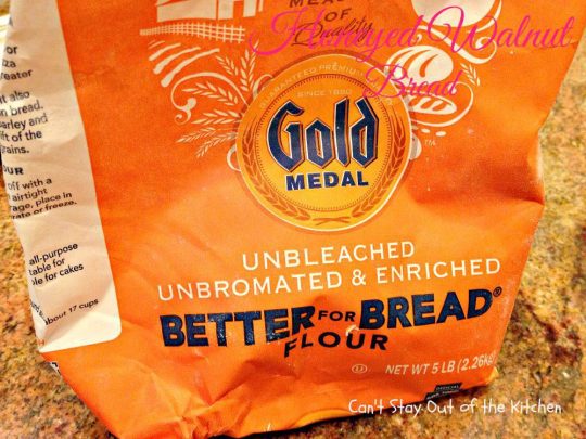 Measure hot water and place in bread canister. Add honey, walnut oil and bread flour. Regular all-purpose flour doesn’t have enough gluten so the bread particles won’t adhere together as well and the bread will get crumbly.