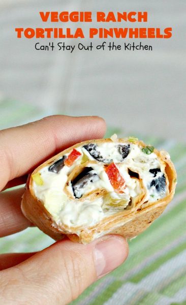 Veggie Ranch Tortilla Pinwheels are really pretty easy to make. I recommend you refrigerate the filled tortillas for several hours — even overnight — before cutting. I warn you in advance, it’s really hard to eat only one of these delicious pinwheels!