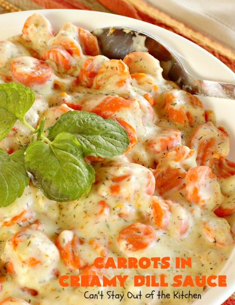 Carrots in Creamy Dill Sauce makes such a wonderful holiday side dish. I love this delightful recipe! I enjoy eating carrots, but I really prefer them cooked in casseroles or served with delicious sauces like Honey Glazed Carrots or Basil Carrots rather than raw–unless they have hummus gobbed all over them!