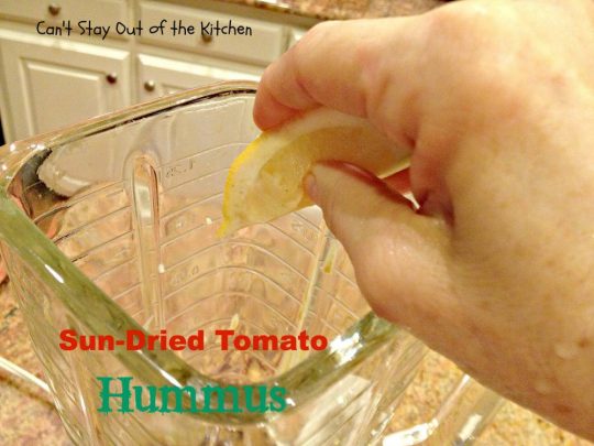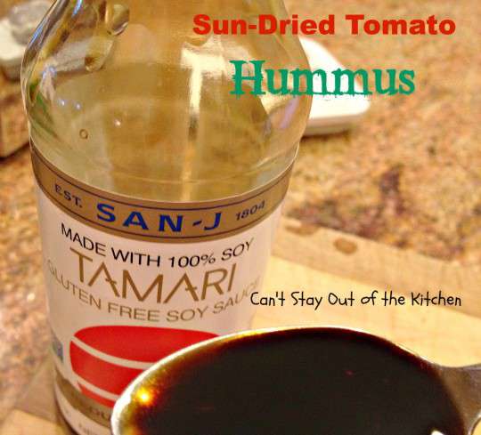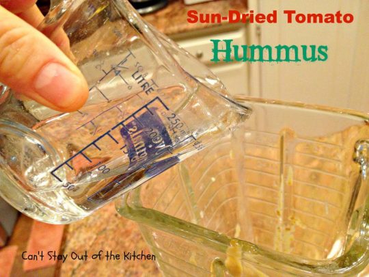 - Put garlic, tahini, reserved garbanzo bean water, lemon juice, tamari, olive oil, salt and sun dried tomatoes in blender or food processor.