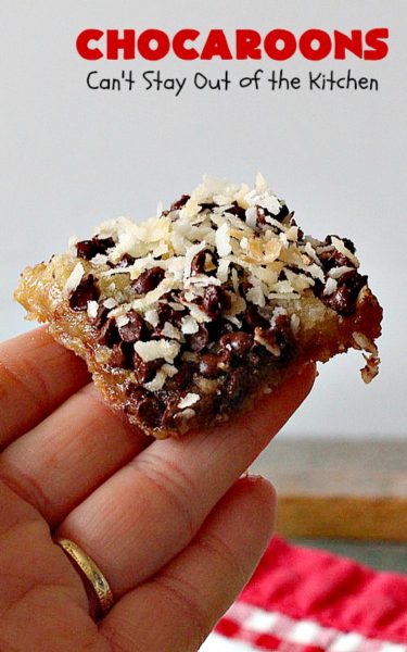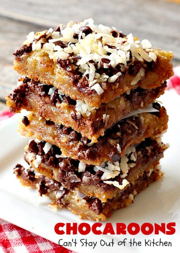 Chocaroons are great party treats and also excellent cookies for holiday baking. Each bar-type cookie is filled with coconut and chocolate chips.