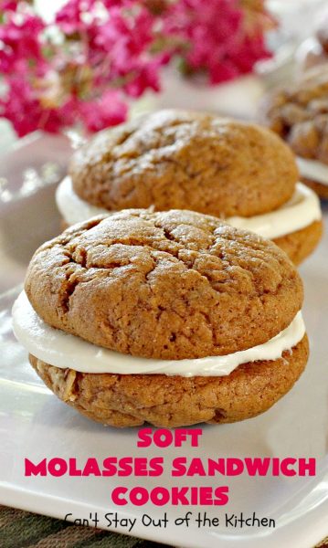 Are you ready for a bite of these sensational cookies? While these cookies are good without the filling, we’ve always preferred to serve them as sandwich cookies rather than plain. Perhaps you can see why they are so highly requested. I get this comment: “Teresa, Are you going to make those Molasses Cookies again this year?” 🙂