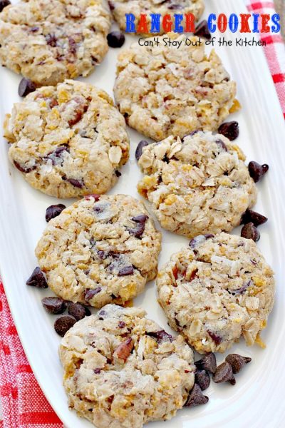 Ranger Cookies are delightful oatmeal cookies. They are filled with lots of great things like coconut, chocolate chips, pecans, and crushed Corn Flakes.