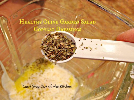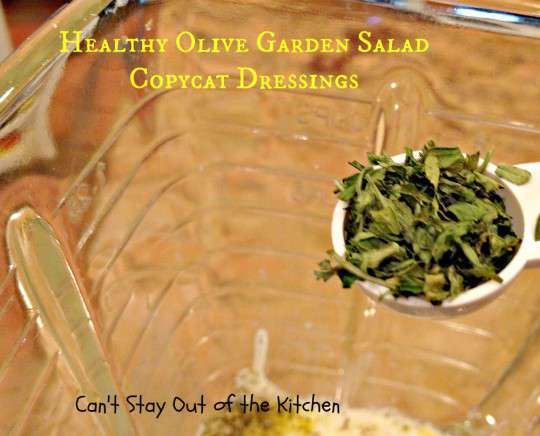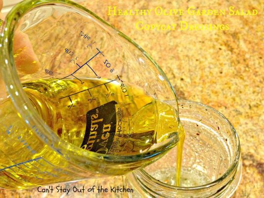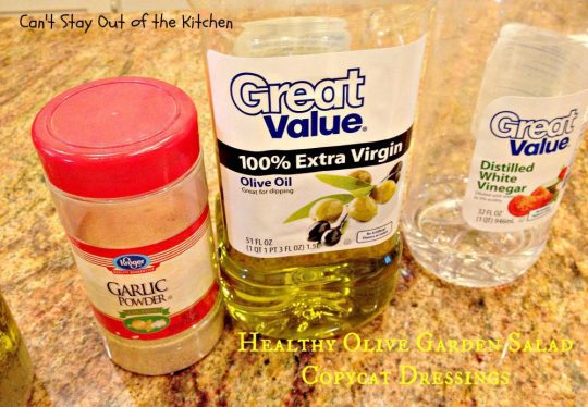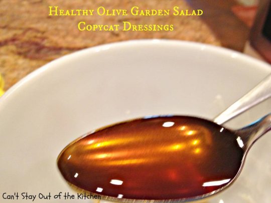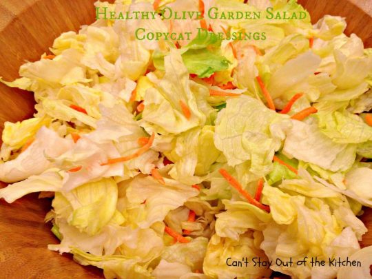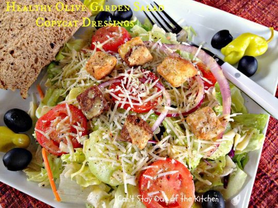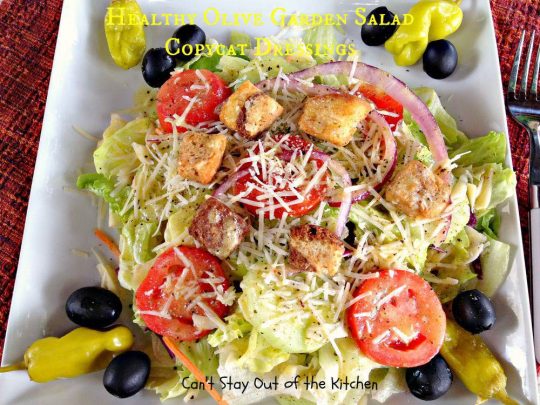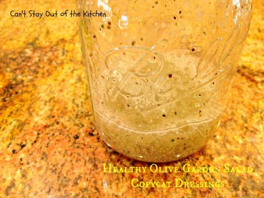 Olive Garden Salad Dressing Copycat recipe is delicious and can be used on any kind of salad you make–whether you try to replicate Olive Garden’s salad or not.