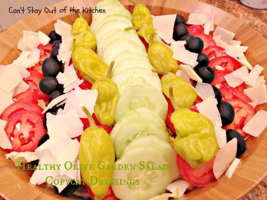 Let me add that I have taken a little license with Olive Garden’s salad. Most Olive Garden’s are notorious for being very stingy on topping ingredients. You are lucky if you get one or two olives, tomato slices, or pepperocinis when your table is served a bowl of their salad. But they load up the bowl with red onion rings! We almost always ask for more tomatoes and dressing, and sometimes extra olives and pepperoncinis too. We prefer salads with more than just lettuce. For this salad I’ve also incorporated cucumbers, which are not on Olive Garden’s salad menu. But since we enjoy them a lot, I included them in the pictures for this post.