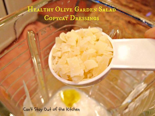 This particular Olive Garden Salad Dressing Copycat Recipe turned out fantastic. I thought it tasted so close to Olive Garden’s dressing. The salad tastes more like Olive Garden’s salad when you add a LOT of freshly grated (fine grate) Parmesan cheese to the salad. Without adding that, you won’t be able to get even close to the original taste.