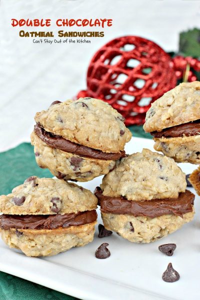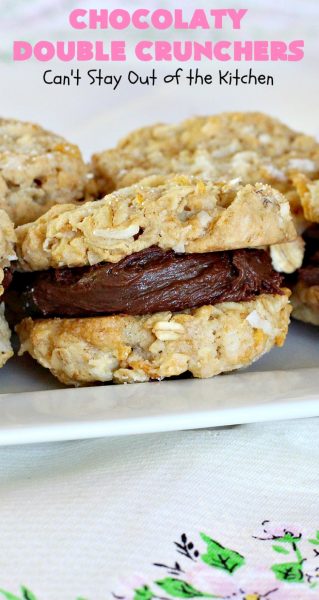 Chocolaty Double Crunchers are delightful sandwich cookies that are nothing short of fabulous! The cookies are made with coconut, oatmeal, and crushed Corn Flakes. Then they are filled with a spectacular chocolate chip-cream cheese filling that puts these cookies way over the top.