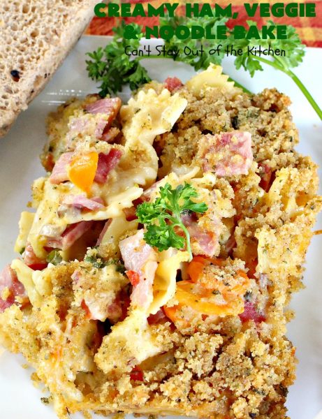 Creamy Ham, Veggie and Noodle Bake has always been one of our family’s favorite main dish casserole recipes. The recipe is topped with buttered Italian bread crumbs which gives the casserole so much additional flavor!