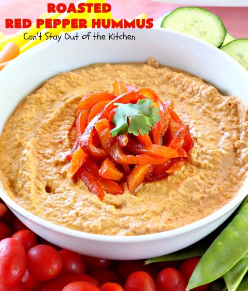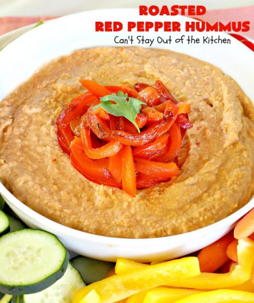 Roasted Red Pepper Hummus | Can't Stay Out of the Kitchen | this is one of the most delectable #hummus #recipes on the planet! It is absolutely succulent & amazing. It's a wonderful treat with #VeggieDippers if you're looking for a #healthy, #LowCalorie, #GlutenFree & #Vegan snack. #appetizer #tailgating #RoastedRedPepperHummus #VeganAppetizer #GlutenFreeAppetizer