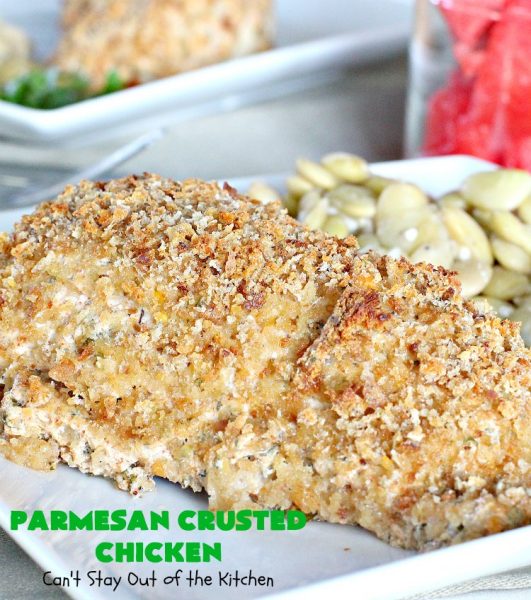 Parmesan Crusted Chicken is simply amazing. I just LOVE this healthy, low calorie, main dish chicken recipe. It has wonderful savory flavors from all the spices and herbs, a lovely sauce made with Greek yogurt and Parmesan cheese, and then crunchy bread crumbs are spread over the top that provide a nice texture–especially since my bread crumbs were homemade and didn’t have the fine texture of most store-bought versions. Substituting Panko bread crumbs with a little additional parsley and garlic or Italian seasoning will accomplish the same crunch for you when you make this dish.
