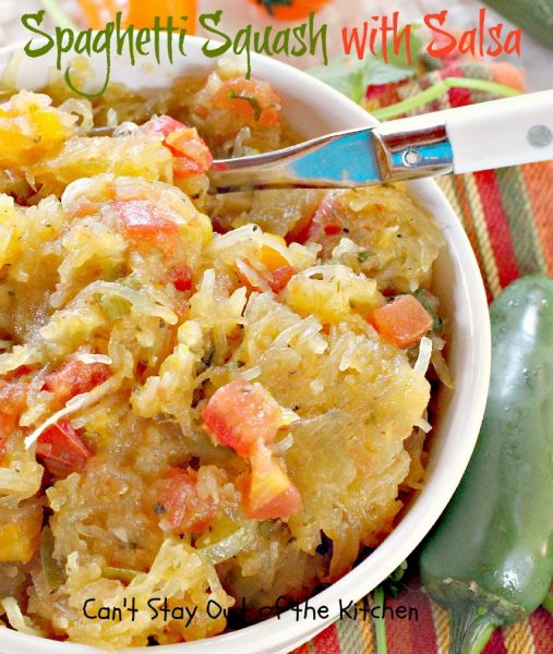 Spaghetti Squash with Salsa | Can't Stay Out of the Kitchen | fantastic #recipe that's marvelous for #MeatlessMondays or as a #SideDish. #Healthy #Vegan #GlutenFree #LowCalorie #Salsa #PicoDeGallo #TexMex #SpaghettiSquash #SpaghettiSquashWithSalsa