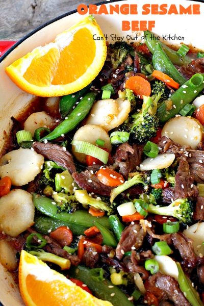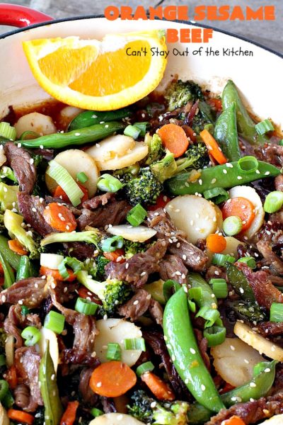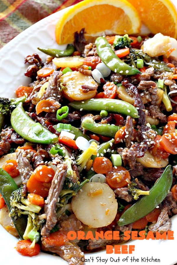 I originally posted this recipe in September 2013. I figured this recipe was due for an update so I recently remade this recipe (March 2018) and took some fresh pictures. This time I scrapped the mandarin orange segments completely and just garnished the dish with fresh navel orange slices. I hosted my son and his girlfriend for dinner and this recipe was perfect for all four of us. My oldest son loves Asian food, so this was a win-win for everyone. We enjoyed Orange Sesame Beef along with Easy Baked Rice, my Winter Fruit Salad with Poppy Seed Dressing and a Gluten Free Blueberry Cobbler with a scoop of Blue Bell ice cream. Yes, it was delightful meal we salivated over for quite some time. 🙂